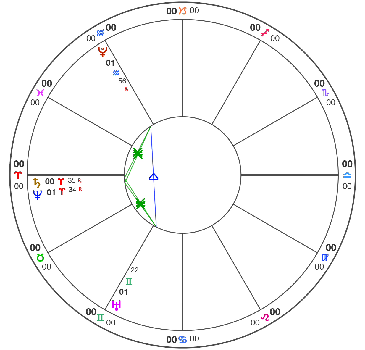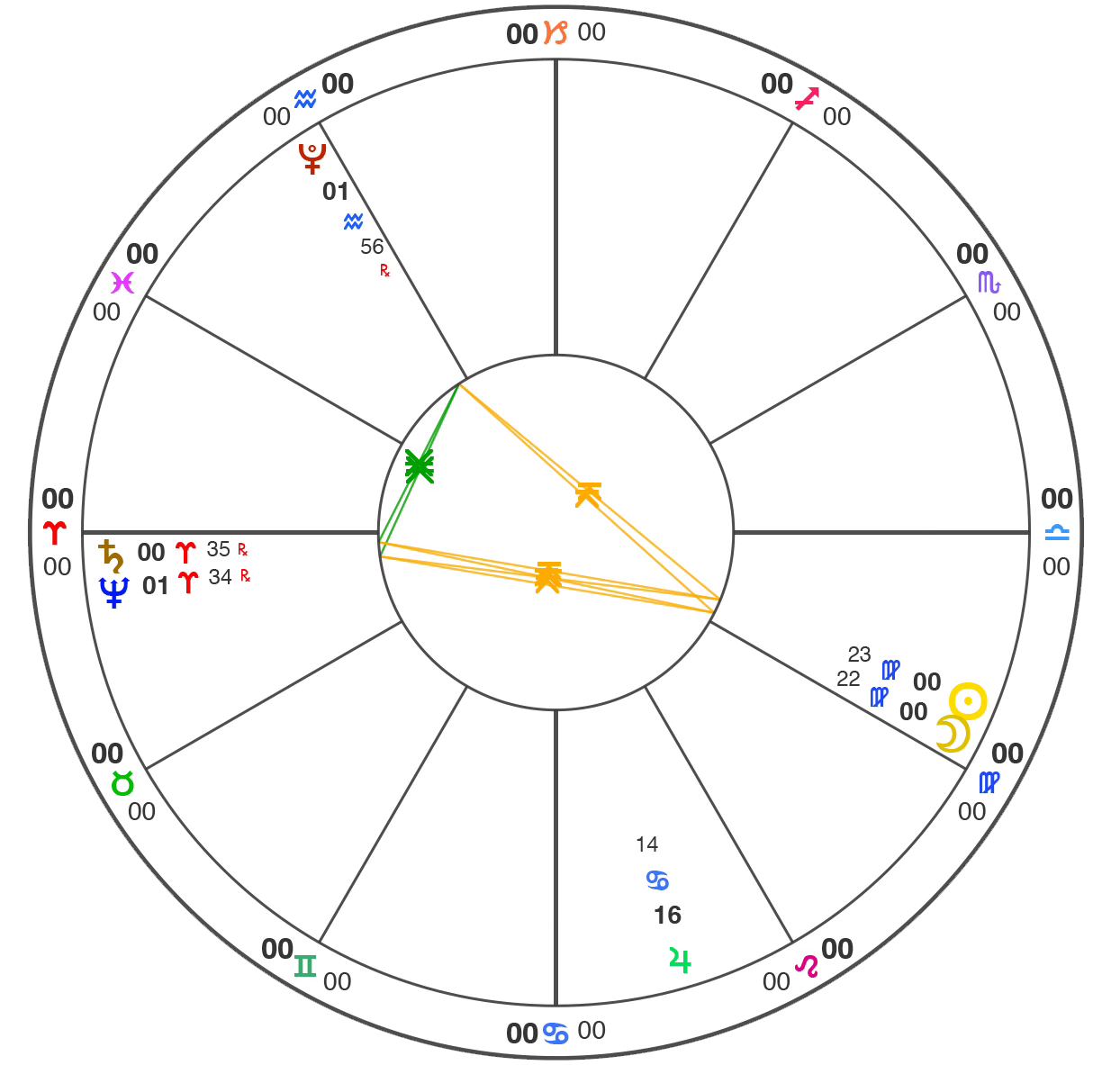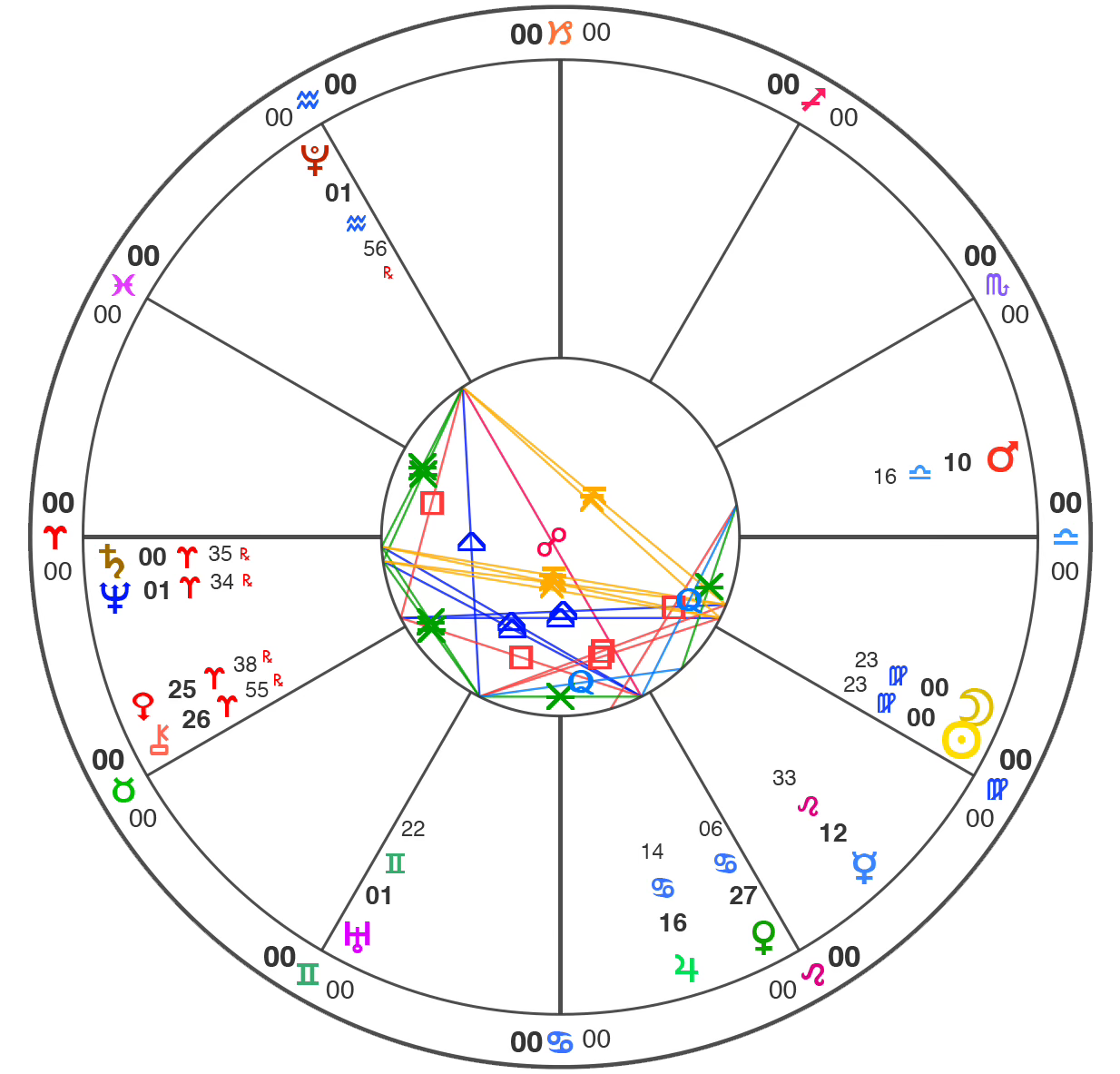 The energetic “wiring” of a chart consists of the angles that planets make to each other, called “aspects.” (the colored lines in the chart). These tell us whether the psychic forces either clash and challenge each other, or coordinate and harmonize.